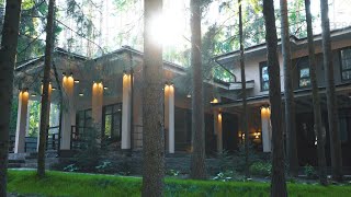 Большой участок с ландшафтным дизайном в лесном массиве. Высажен и превосходно ухожен газон, а декоративные сосны полностью погружают в атмосферу сказочного леса.