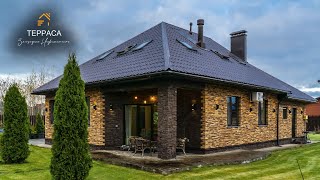 Стены – прочный газоблок 400 мм. + фасадное утепление 50 мм. + эффектная отделка дома выполнена под кипрский камень.